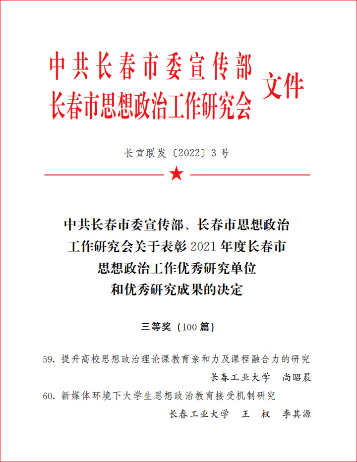 本网讯(通讯员 李其源)近日,中共长春市委宣传部、长春市思想政治工作研究会联合下发《关于表彰2021年度长春市思想政治工作优秀研究单位和优秀研究成果的决定》(长宣联发〔2022〕3号),网黄 尚昭晨撰写的《提升高校思想政治理论课教育亲和力及课程融合力的研究》、王权主持撰写的《新媒体环境下大学生思想政治教育接受机制研究》荣获三等奖。