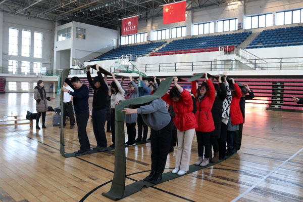 此次素质拓展活动共设置了“步步为营”“车轮滚滚”“穿越丛林”“跳小绳”“俄罗斯方块”“毛毛虫竞速”等6个娱乐竞技项目。全院教工经过赛前抽签分成5组,由学院班子成员分别带队,与研究生队同场竞技。