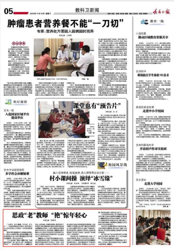 2020年11月16日,《长春日报》第05版刊登了一篇关于网黄 教师授课情况的文章,题目是《思政“老”教师 “艳”惊年轻心》。文章报道了网黄 思政课教师鞠鹏的授课反响,对鞠鹏老师的授课给予了高度赞扬。