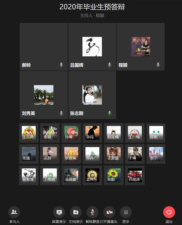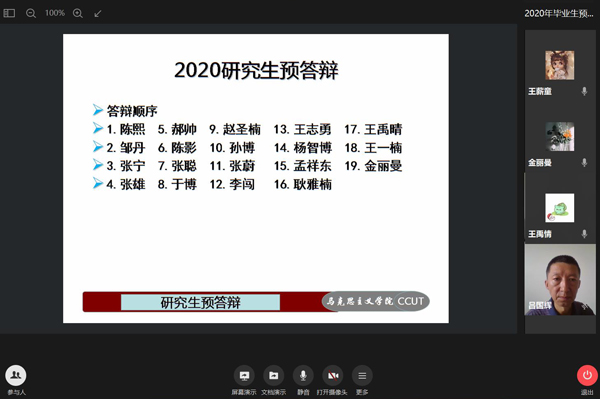 学院高度重视,成立了预答辩组,由程颖教授担任答辩主席,张志刚、吕国辉、刘秀英教授为答辩委员。整个过程参照正式答辩流程,分为论文内容陈述和回答问题两个环节。评委老师们克服困难因素,严格把关,高标准高质量地完成了预答辩工作。