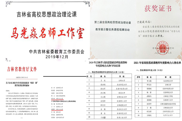 思政课教指委委员,1人荣获全国高校思政课教师年度影响力人物,4人入选“全国高校优秀中青年思想政治理论课择优资助计划”,1人获批吉林省名师工作室,3人获得吉林省高校思政课教师年度影响力人物,2人获得吉林省高校思政课教师年度影响力人物提名。
